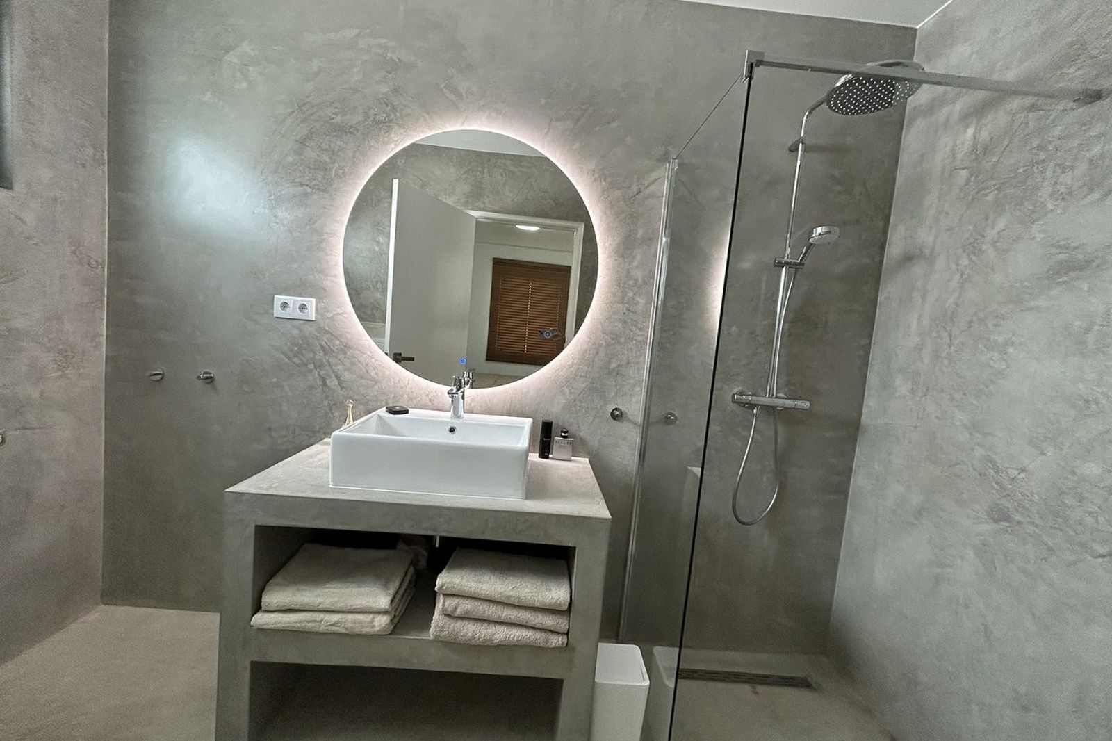 The apartment features two spacious bedrooms, each with its own en-suite bathroom, and a bright, open living room with direct access to a private terrace and magnesium pool. The open kitchen is fully equipped with modern appliances, including a combi-oven, stovetop, microwave, coffee maker, and toaster.