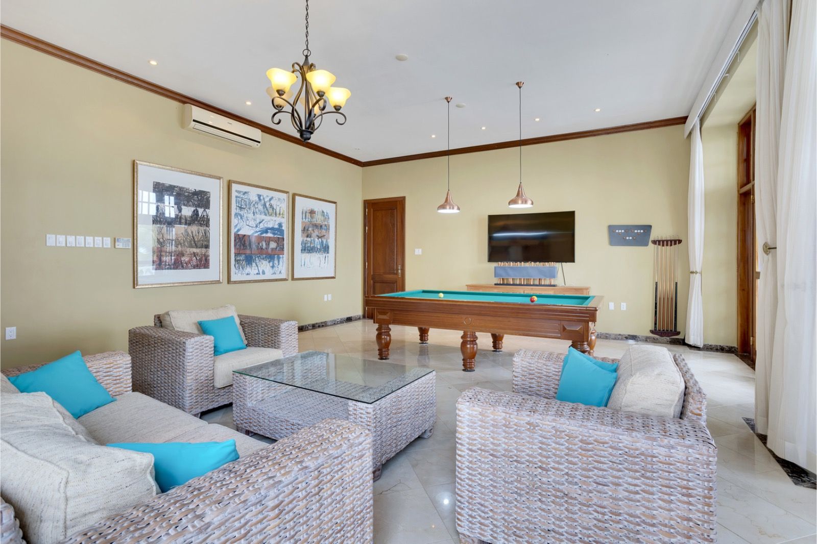Secondly, the middle (and ground) floor can be entered through the elevator. Here you will find the entertainment, laundry and office level of Isla Bella. The entertainment room consists out of a gigantic TV and billiards table. The two other bedrooms with king size beds with en-suite bathrooms can be found on the ground floor as well.
