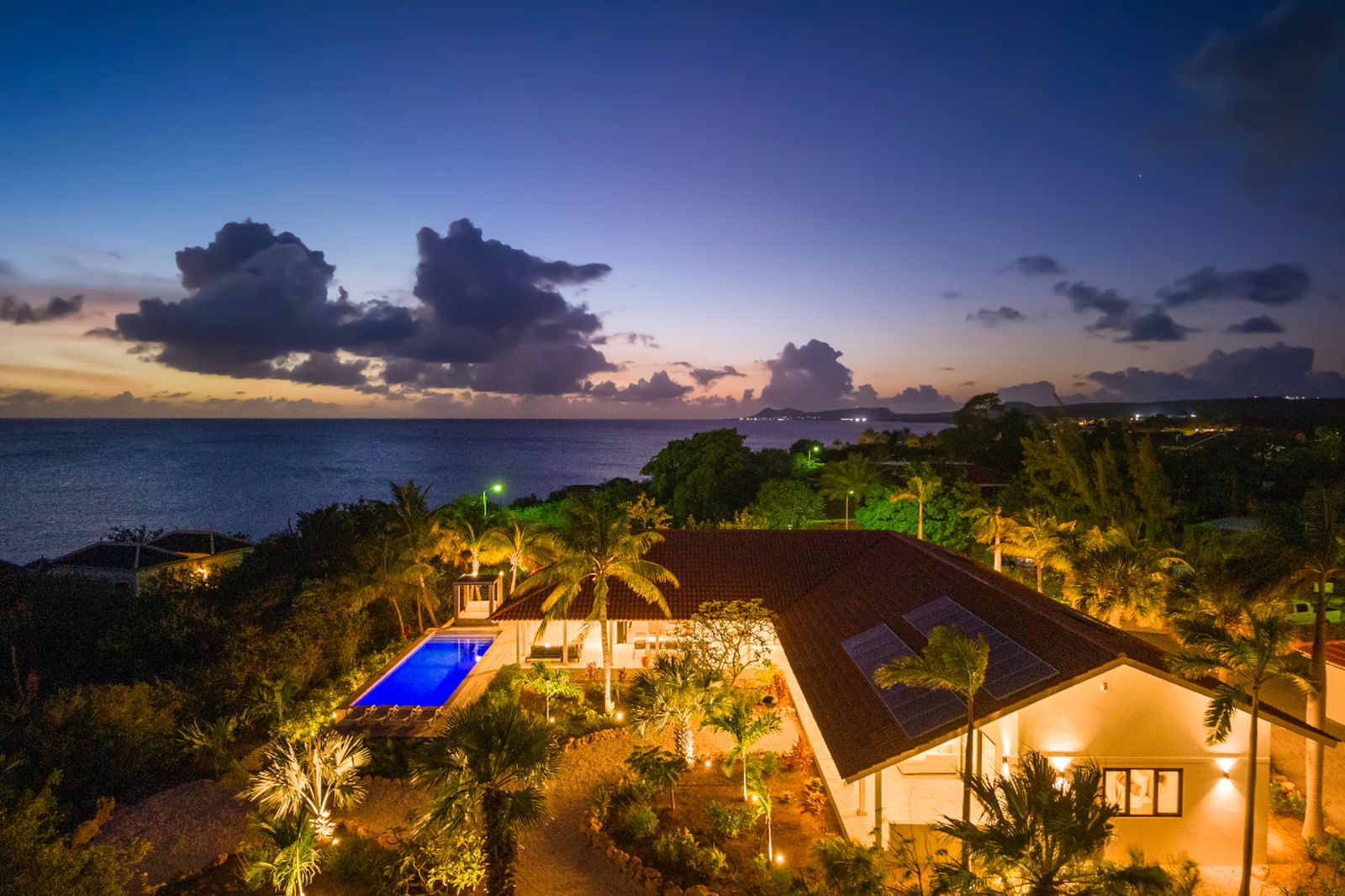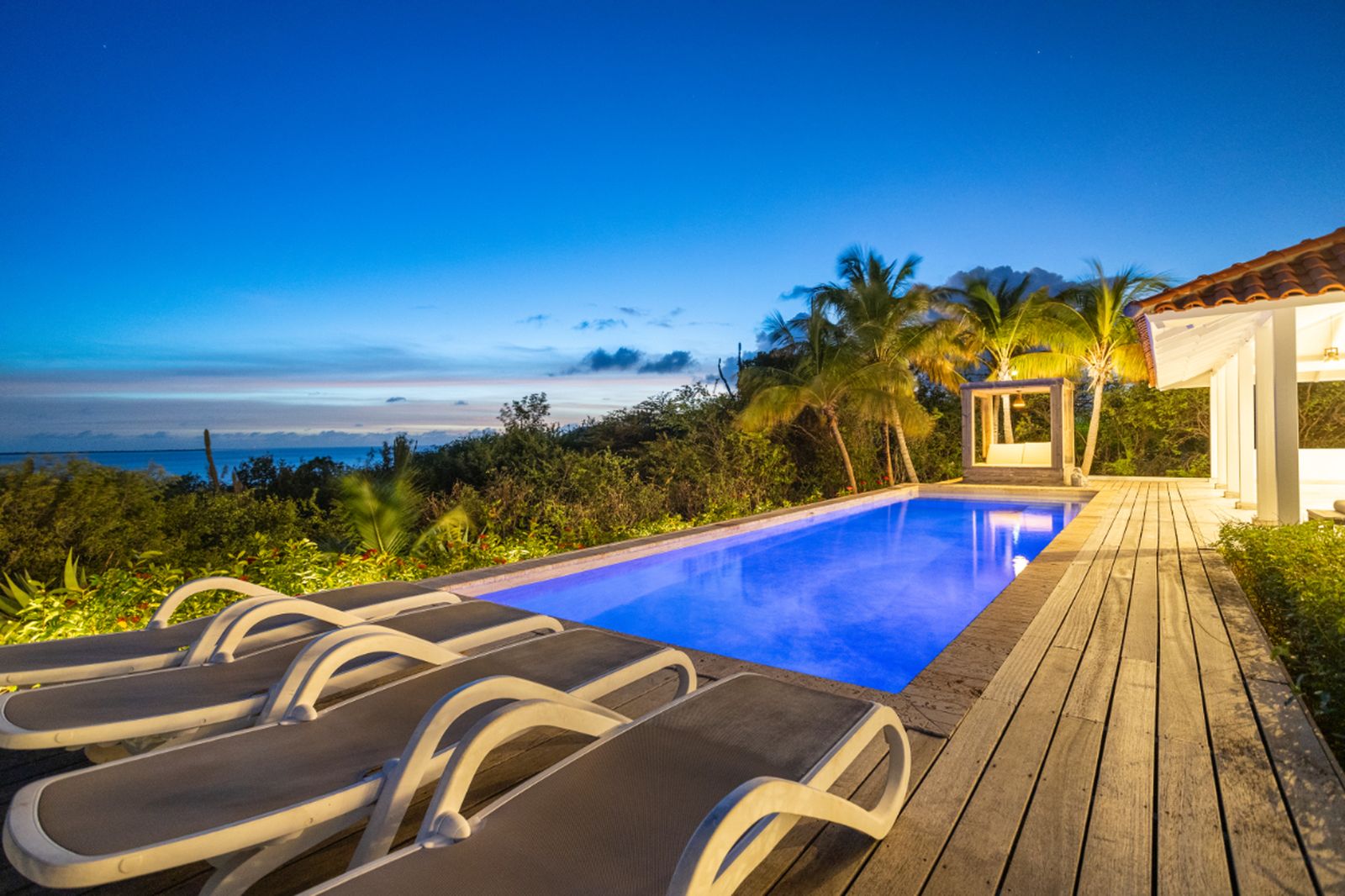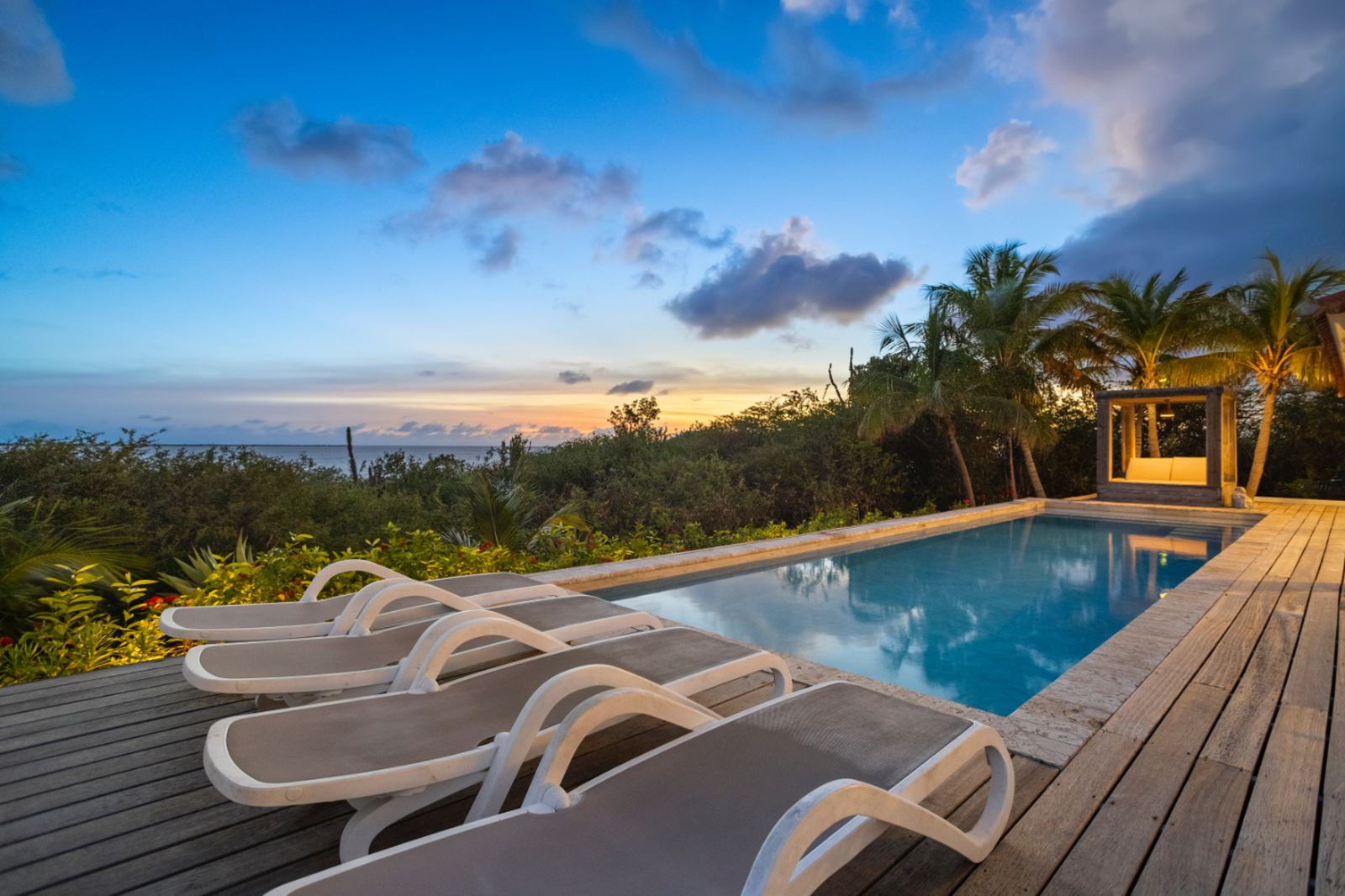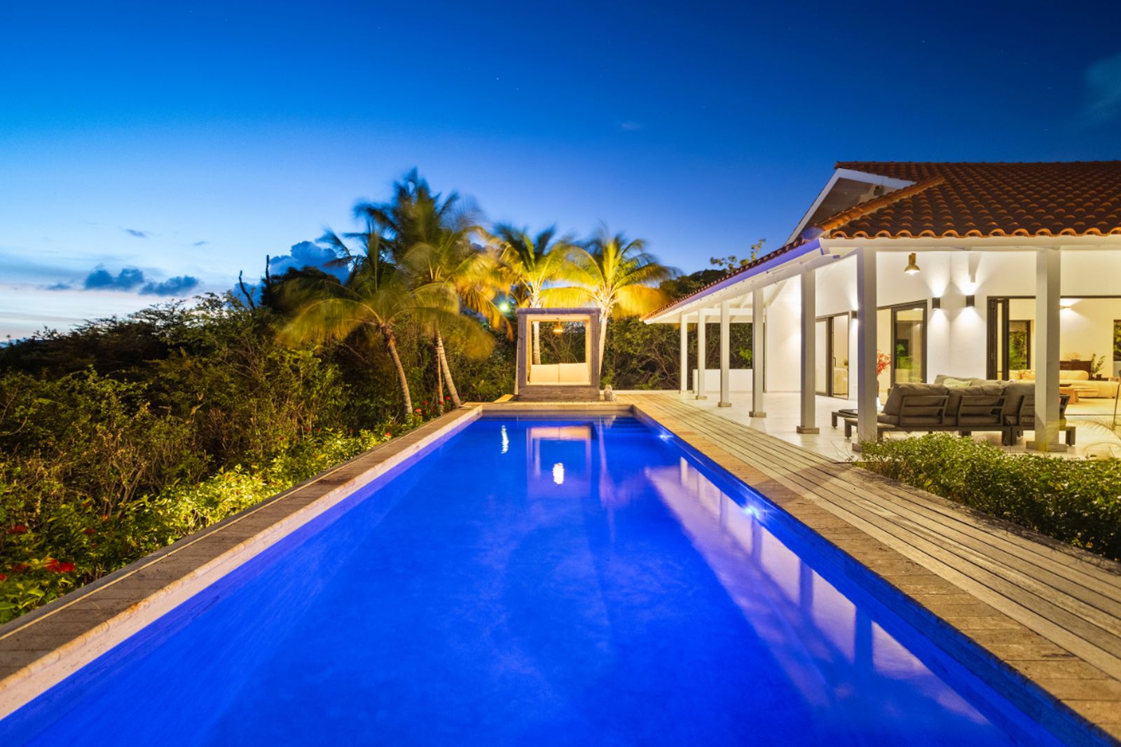 The large living area with an open island kitchen forms the heart of the home. All doors can be fully opened, allowing the refreshing trade winds to flow through the villa and creating a seamless indoor-outdoor living experience. From both the terrace and the pool area, you can enjoy breathtaking views of the Caribbean Sea – perfect for relaxing, sunbathing, reading a book, or enjoying an evening meal while watching a vibrant sunset.