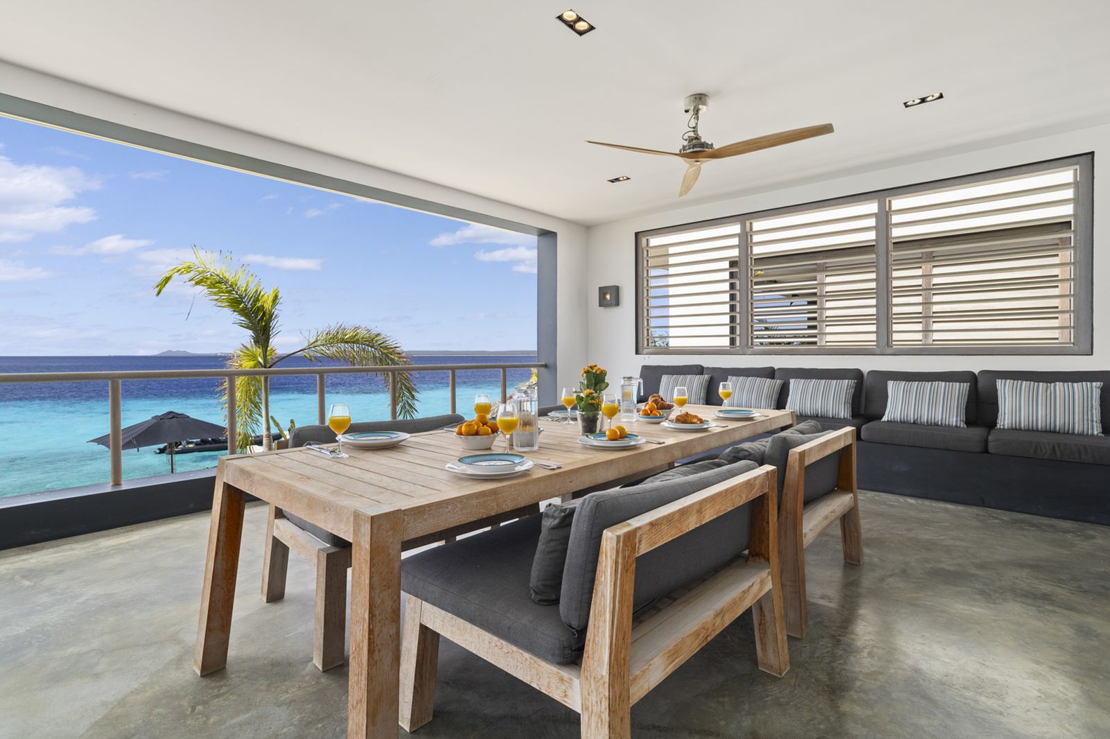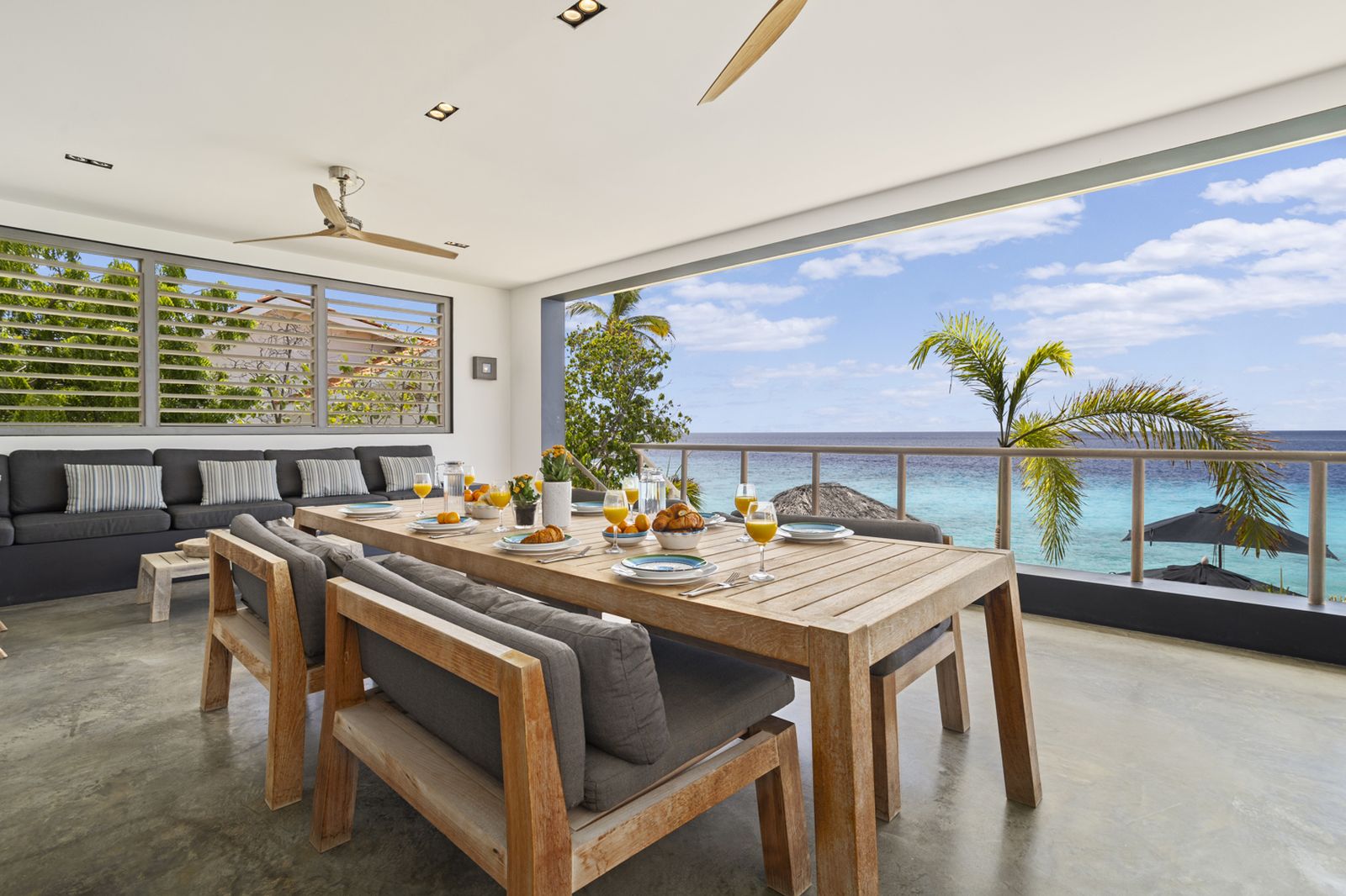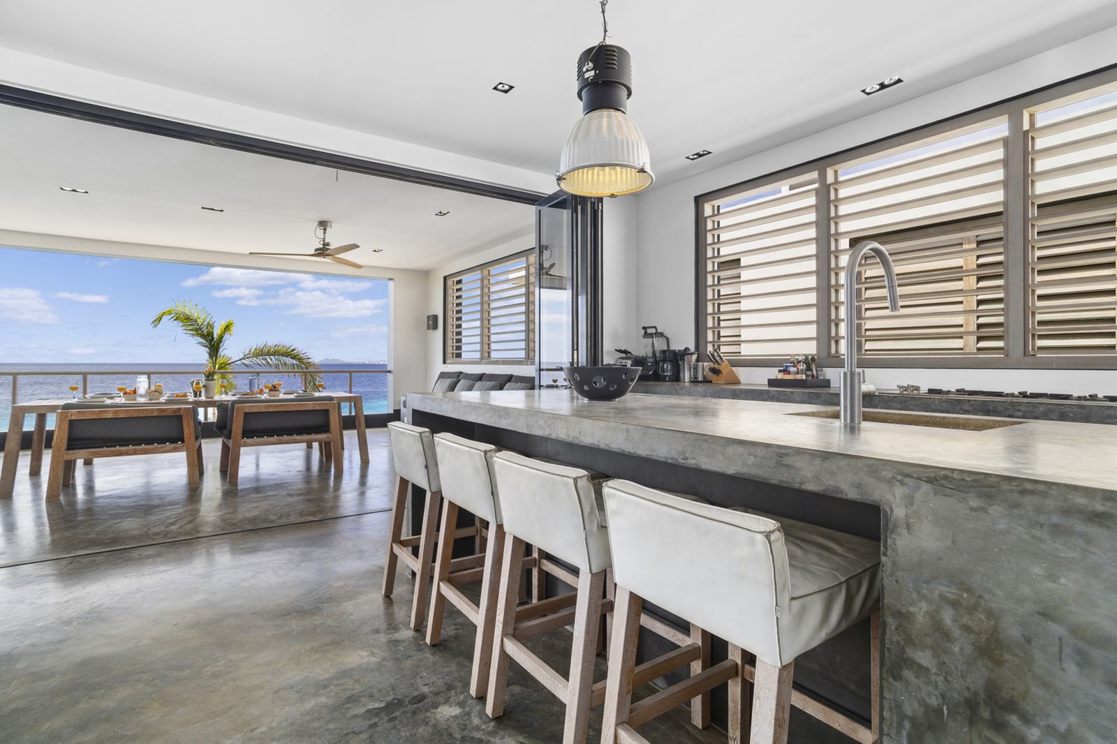 Op de bovenverdieping bevindt zich de grote keuken uitgerust met hoogwaardige apparatuur. Naast de keuken is het woongedeelte met zowel binnen als buiten een grote eettafel. Hier kunt u heerlijk ontspannen met een prachtig uitzicht over de Caribische Zee.