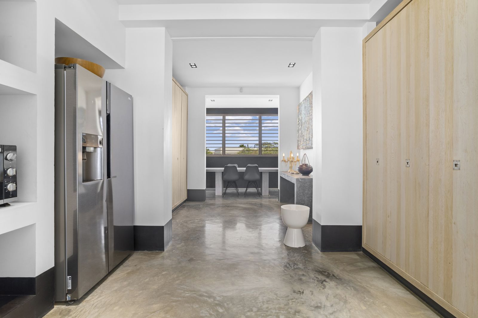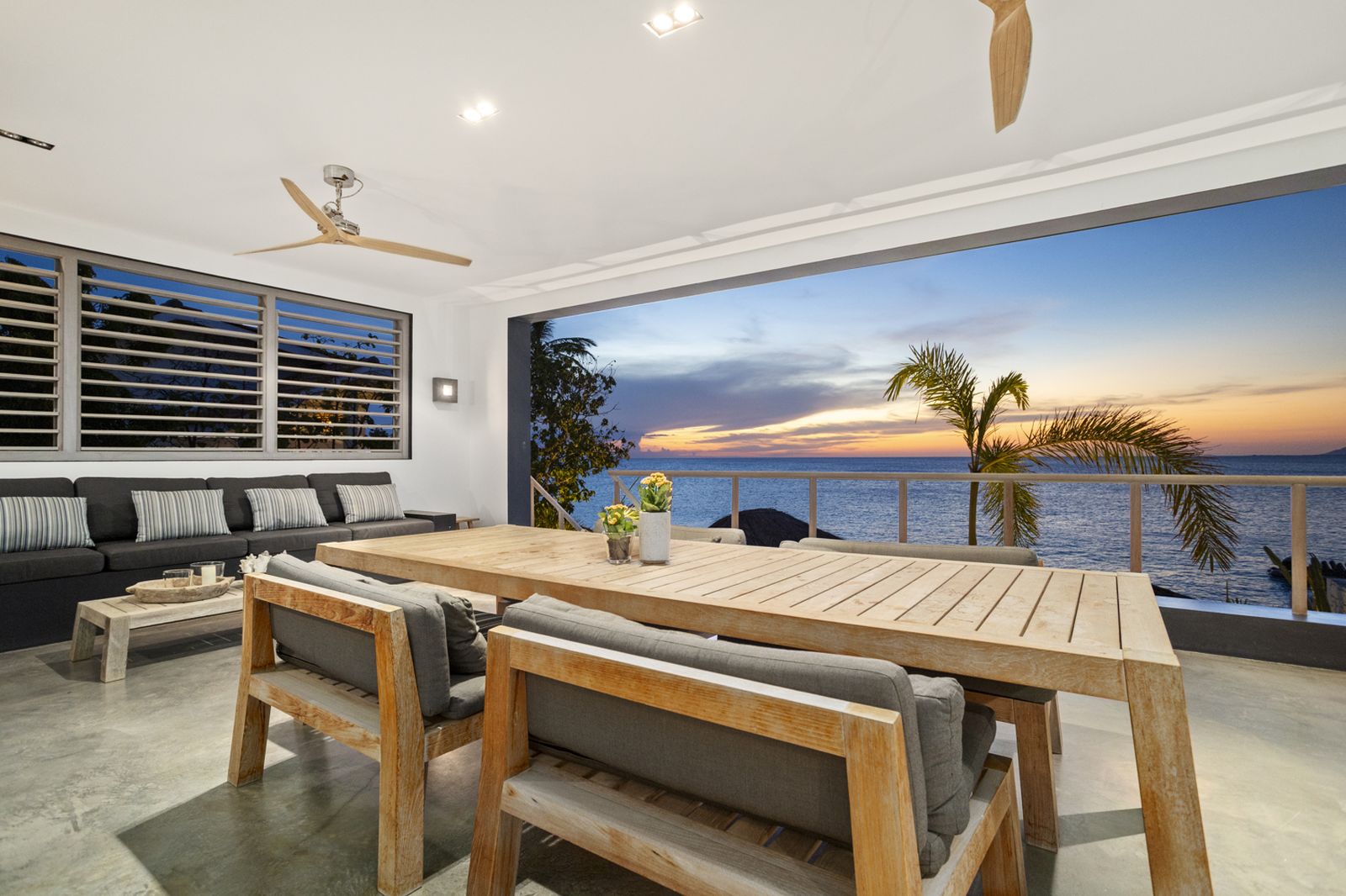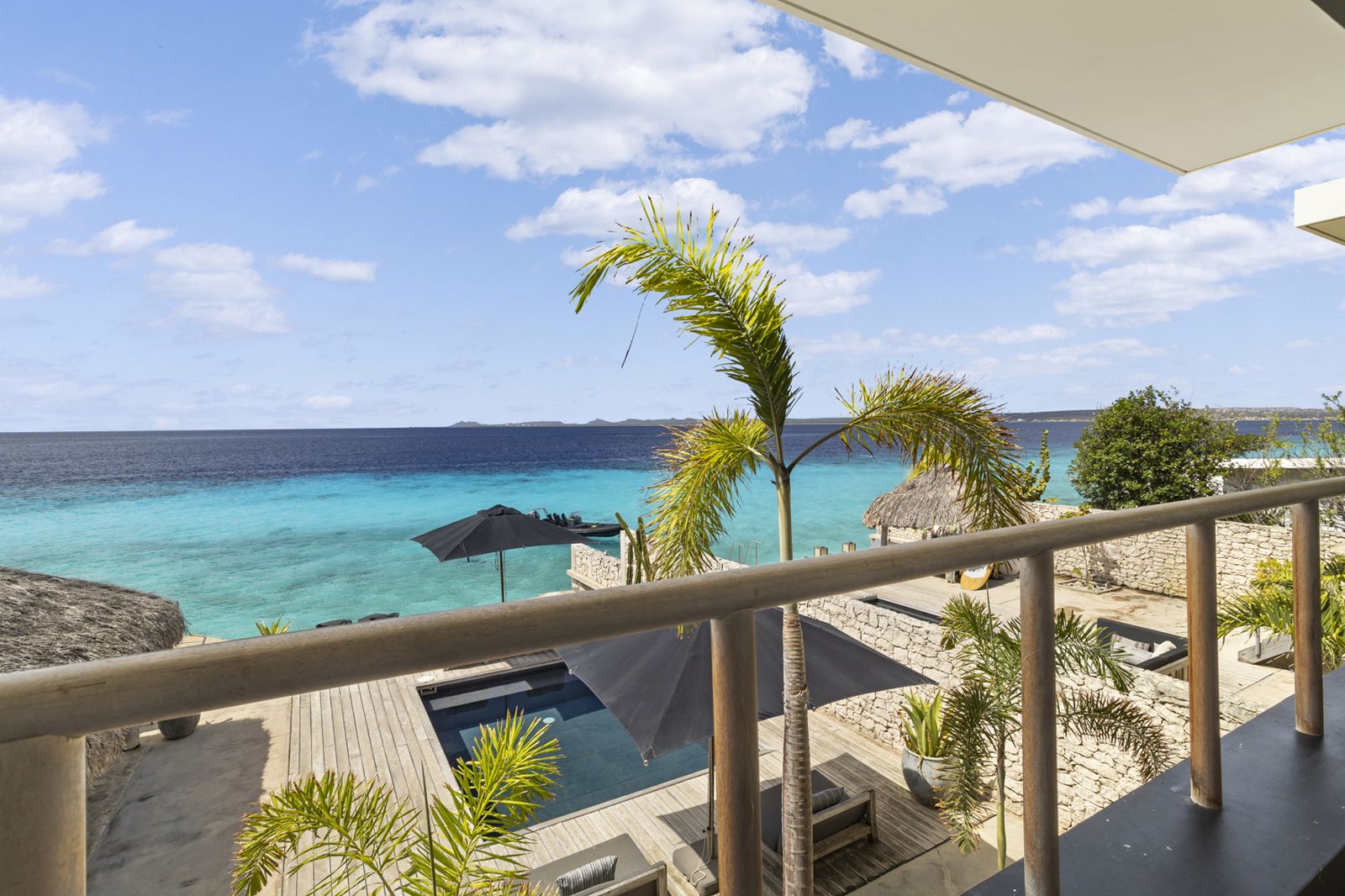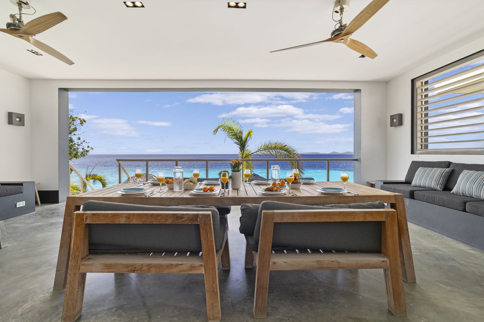 Op de bovenverdieping bevindt zich de grote keuken uitgerust met hoogwaardige apparatuur. Naast de keuken is het woongedeelte met zowel binnen als buiten een grote eettafel. Hier kunt u heerlijk ontspannen met een prachtig uitzicht over de Caribische Zee.
