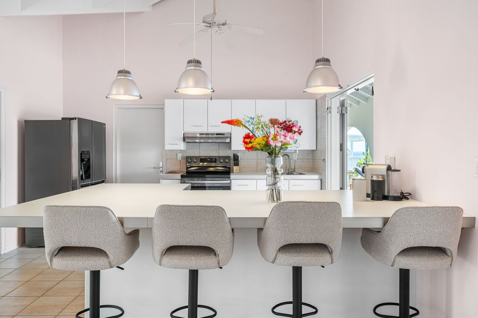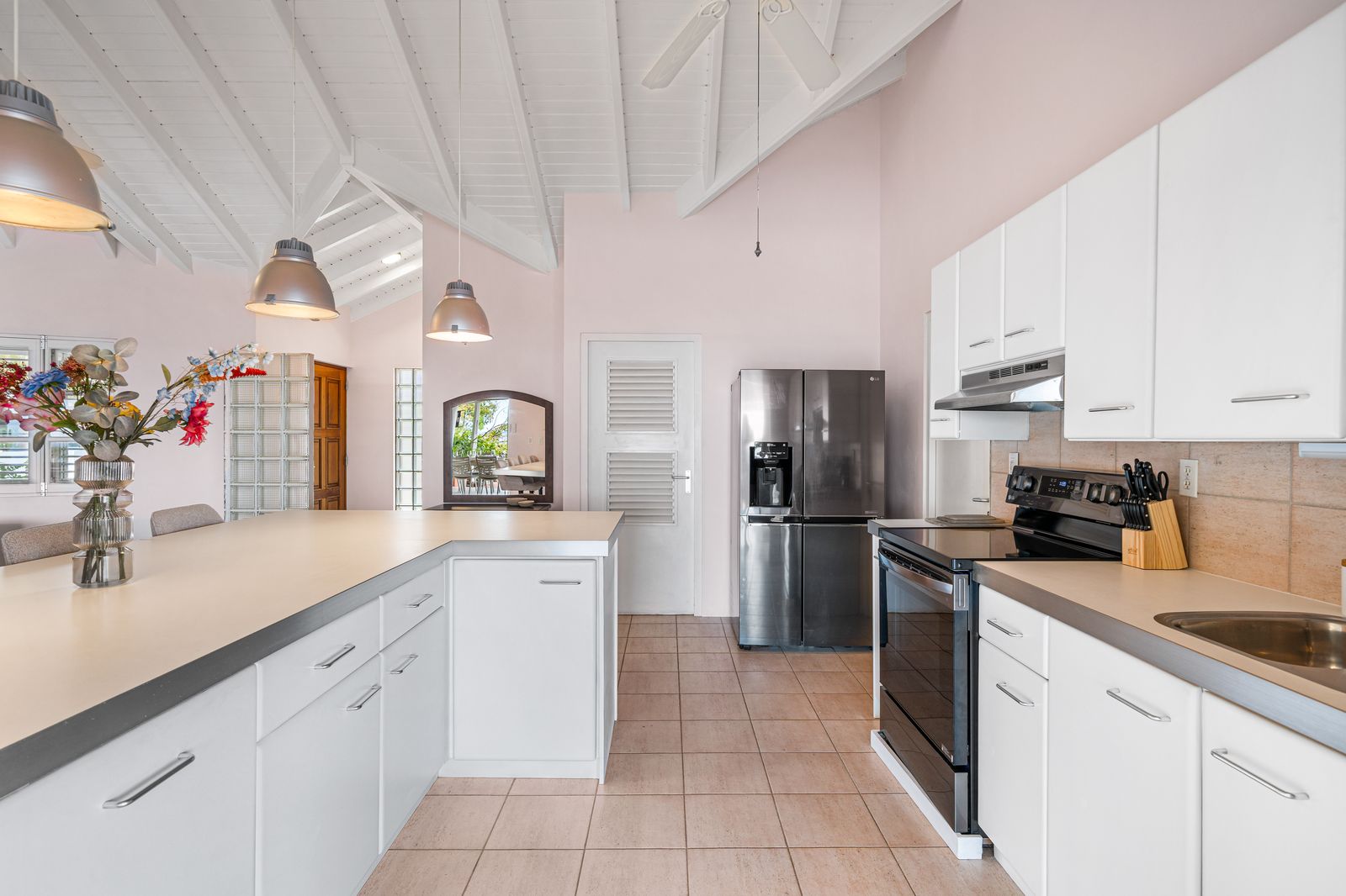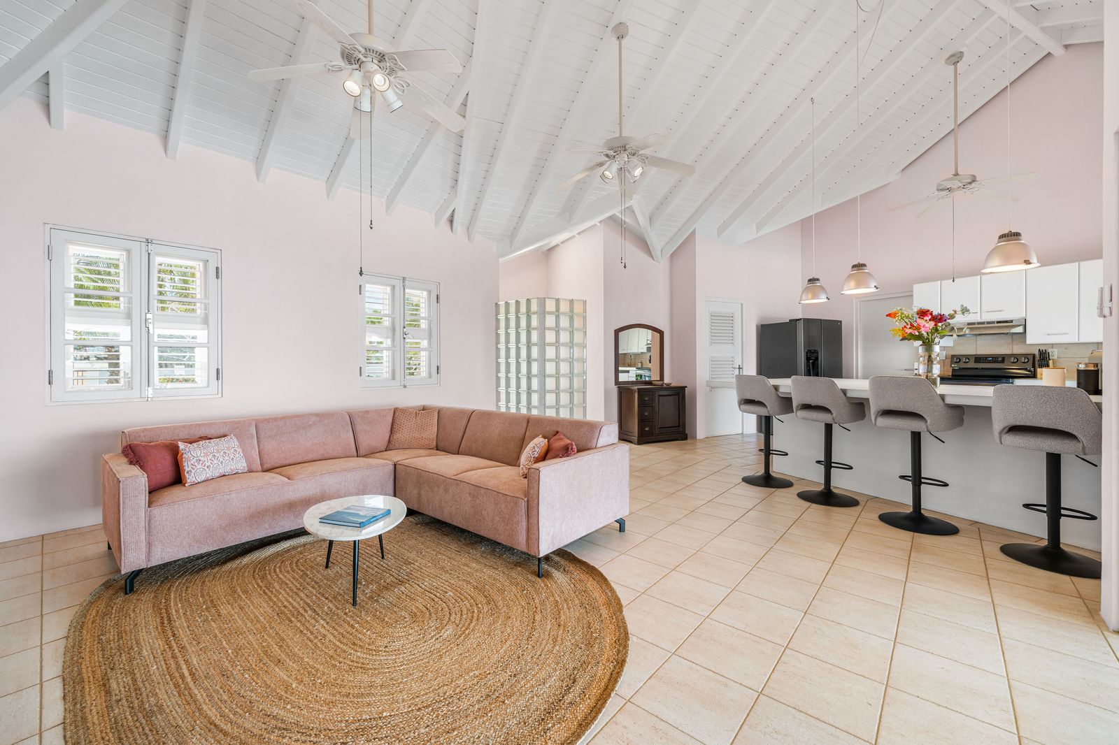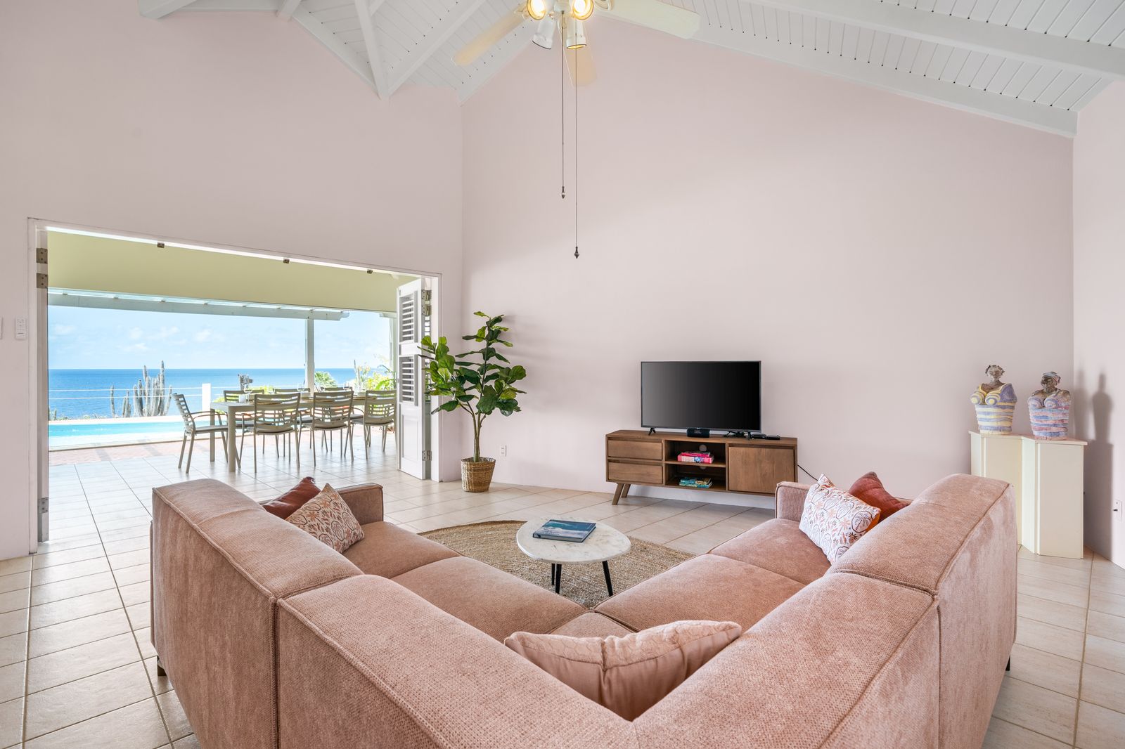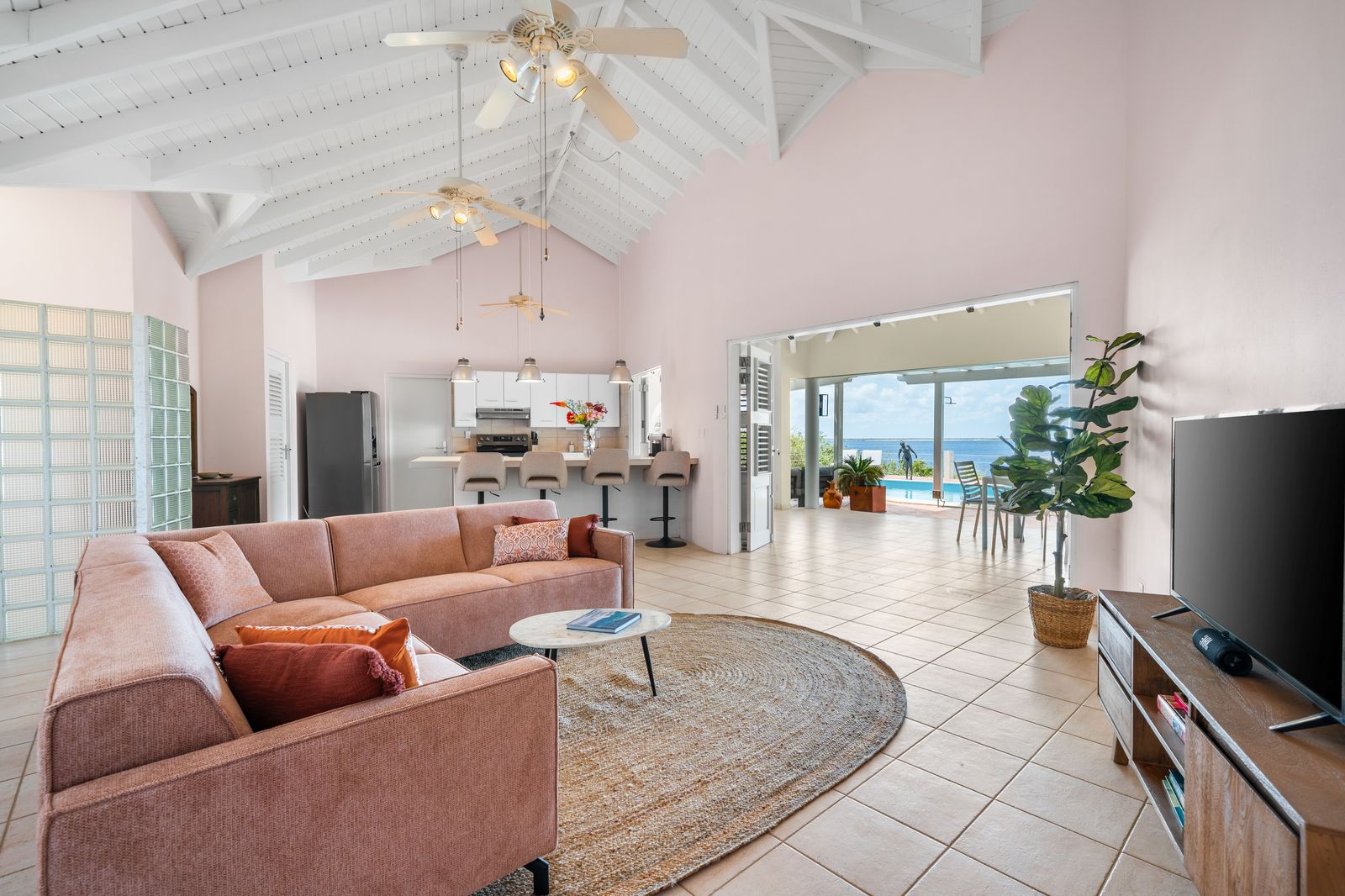 De woonkamer is licht en luchtig, met comfortabele banken, een flatscreen-tv en warme, natuurlijke materialen die een echte eilandsfeer geven. Grote deuren en luiken laten de frisse zeebries binnen, en als het nodig is kun je de airconditioning gebruiken.