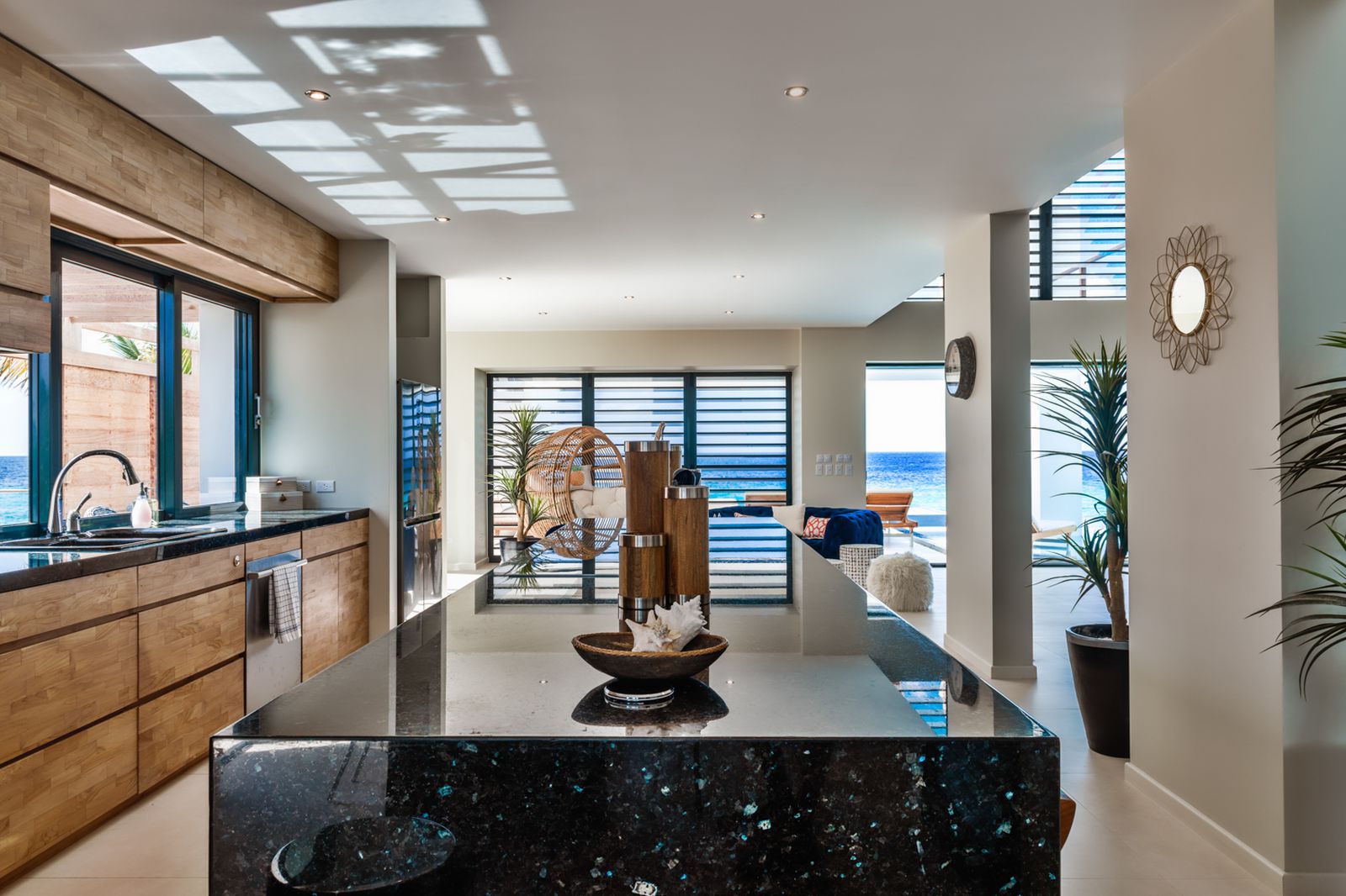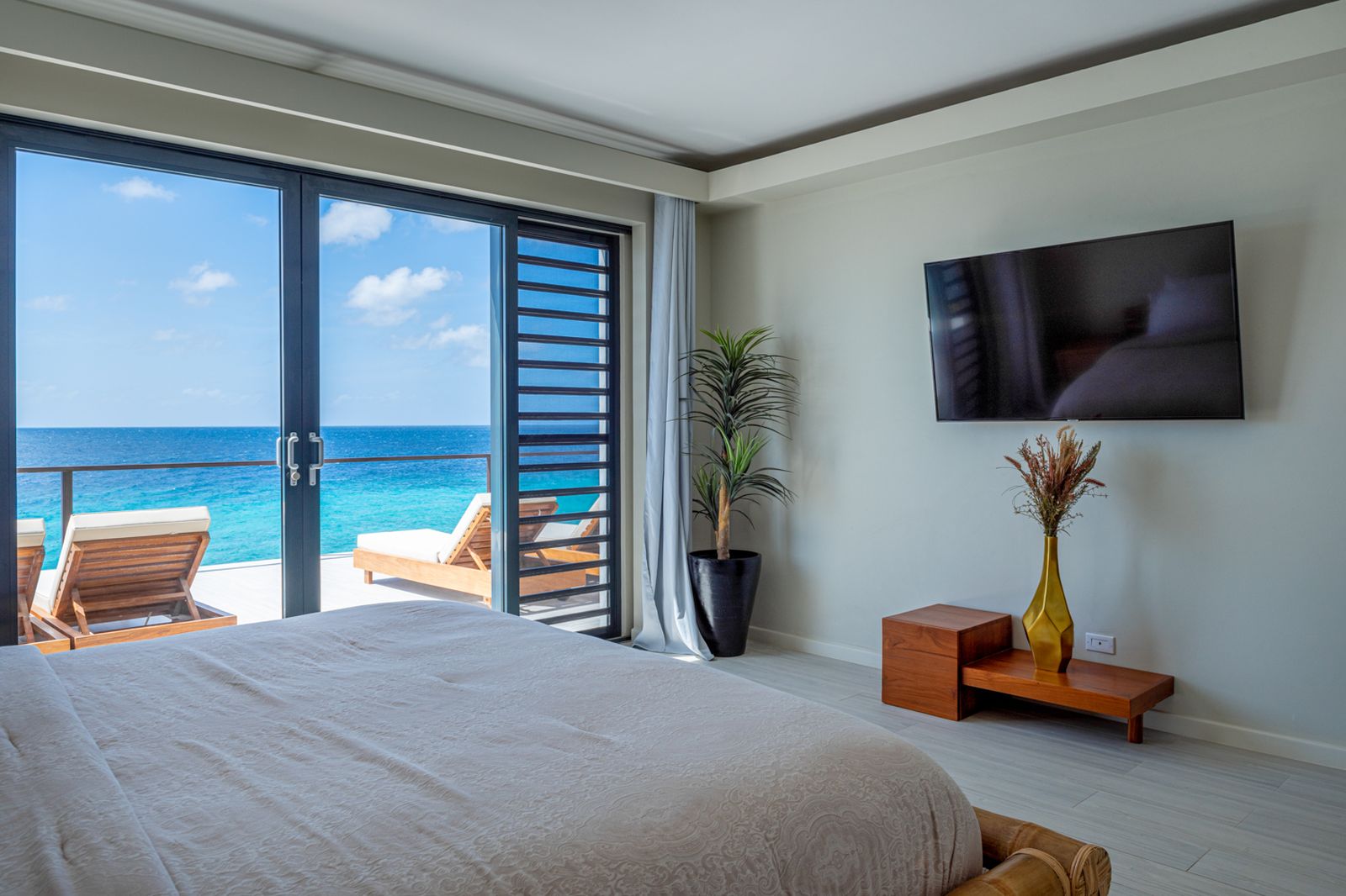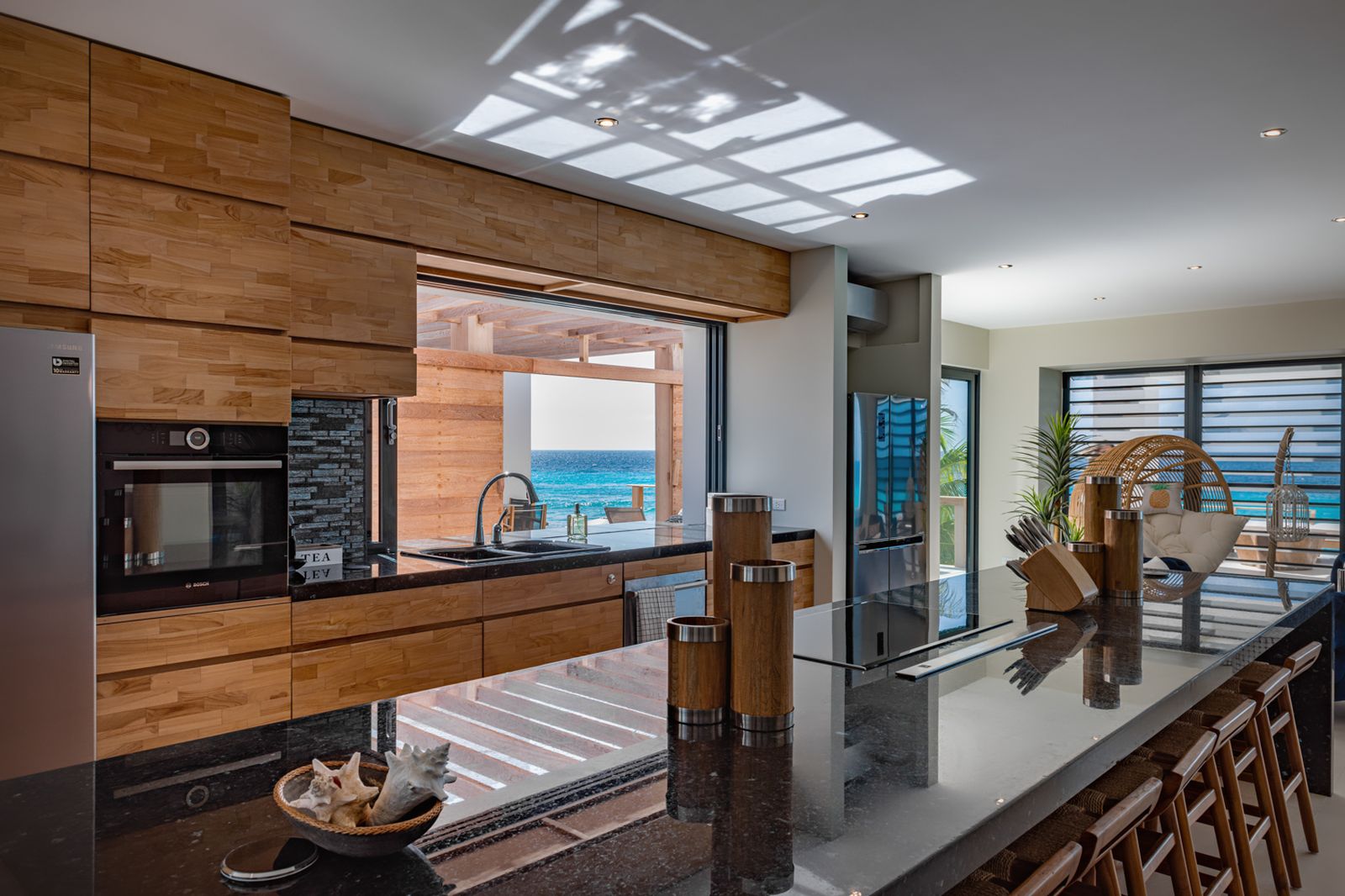 From the moment you step inside, the open design draws your eyes straight to the deep blue Caribbean Sea. Floor-to-ceiling sliding glass doors let in abundant natural light, while the neutral color palette and high-quality finishes create a sense of luxury, calm, and timeless elegance. Polished concrete floors, warm wooden accents, and carefully selected materials enhance the exclusive character of this villa.