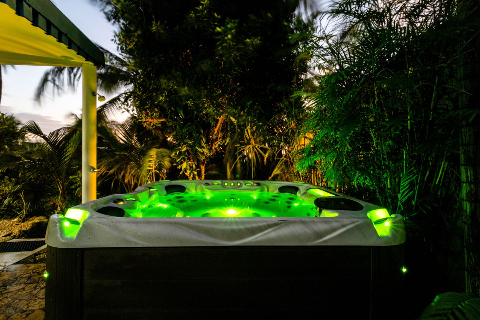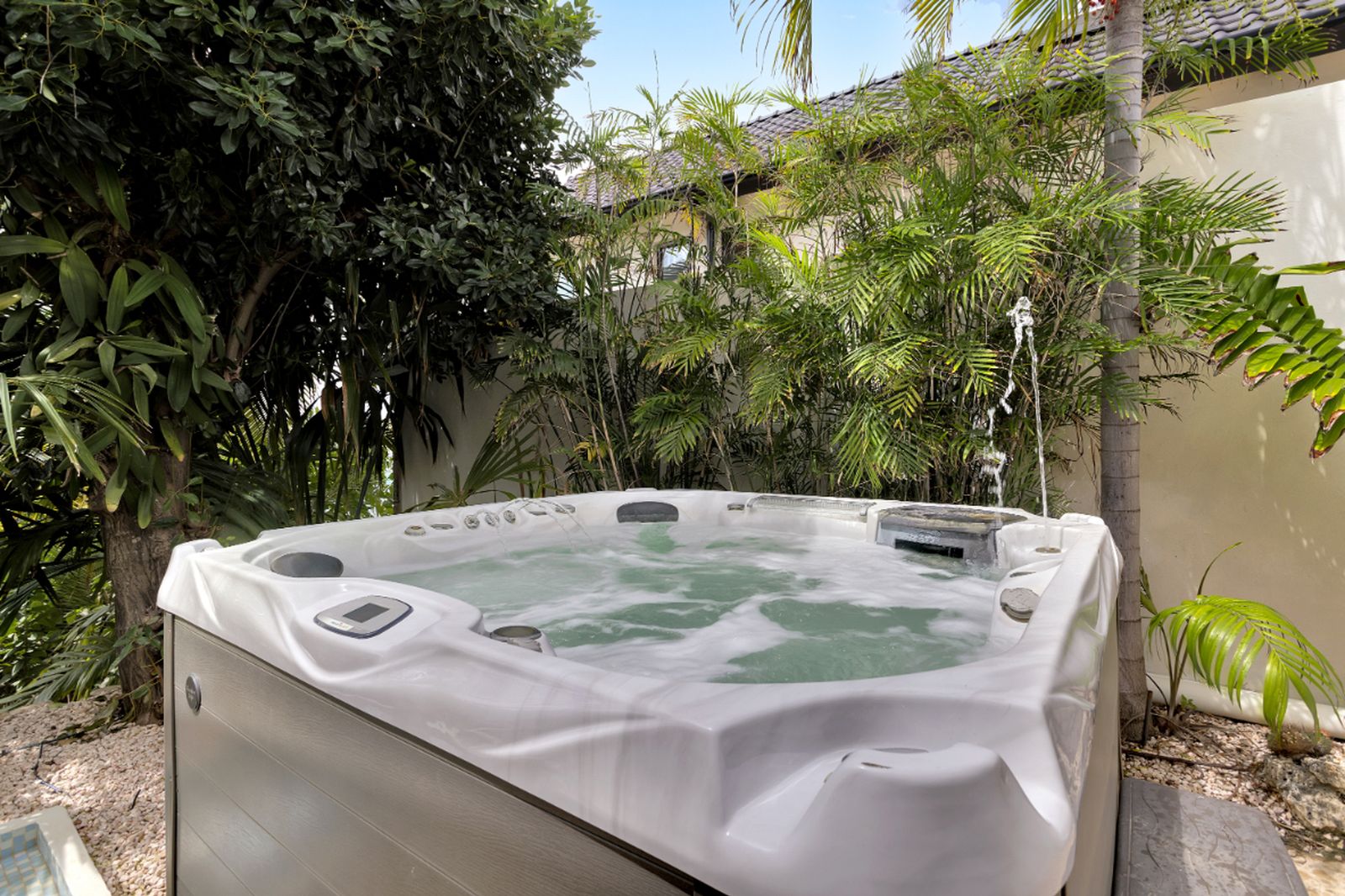 In the garden, surrounded by beautiful tropical plants, you’ll also find a wonderful jacuzzi where you can unwind under the stars while listening to the gentle sounds of the sea.