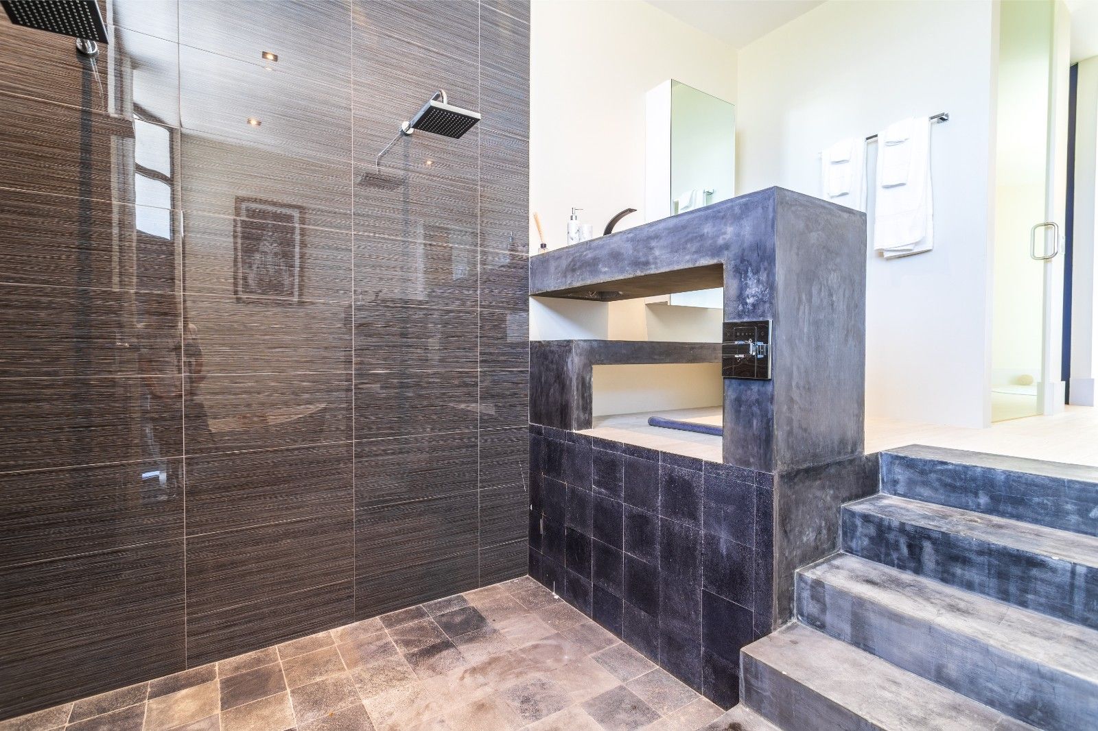 Op de begane grond vind je een slaapkamer met en-suite badkamer aan de achterzijde van het huis. De 5e slaapkamer met stoomdouche bevindt zich aan de voorzijde van het huis. Vanuit deze slaapkamer kun je ook de schuifdeuren openen en op de veranda stappen om in het zwembad of de jacuzzi te duiken.
