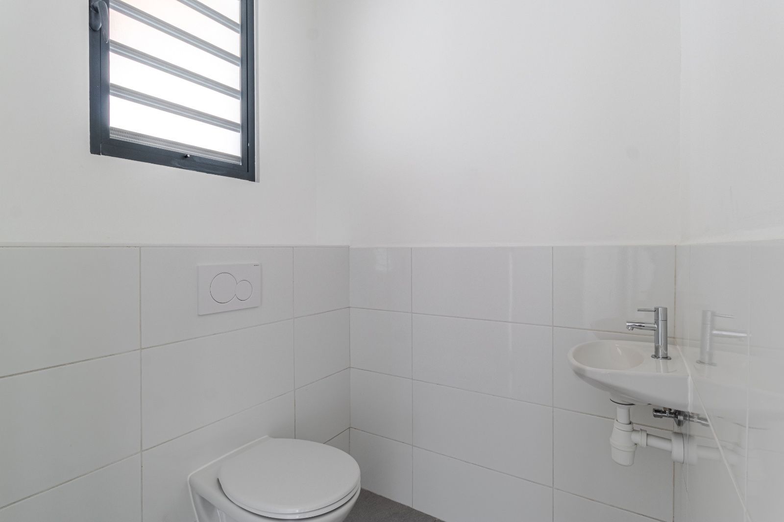 Het appartement heeft een privé-ingang en een lichte, open woonkamer die naadloos overloopt in de moderne keuken. De keuken is voorzien van hoogwaardige inbouwapparatuur en biedt veel opbergruimte. Daarnaast is er een apart gastentoilet en een wasruimte. Via de dubbele openslaande deuren bereik je het 32m² grote terras, dat gedeeltelijk wordt overschaduwd door een houten pergola – een perfecte plek om te ontspannen of gasten te ontvangen.